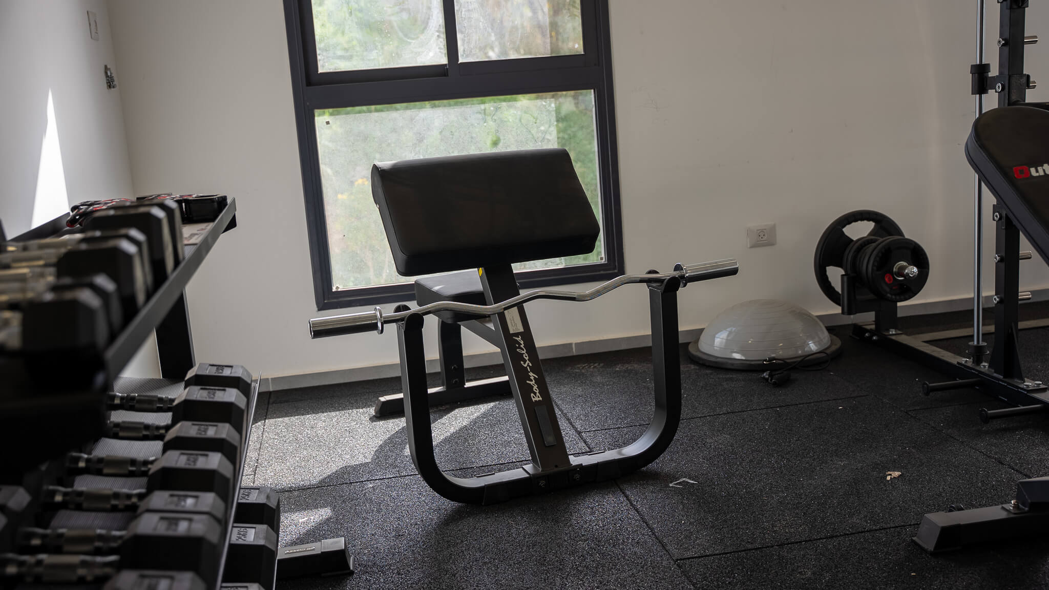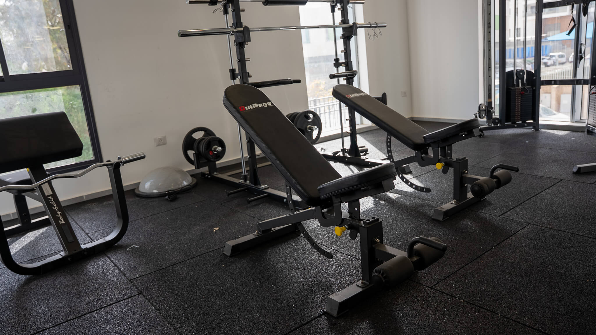 ✔ פינת משקולות חופשיות הכוללת ספות כושר מקצועיות, לצד מתקנים משלימים כמו כיסא כומר מקצועי וכיסא רומי לחיזוק שרירי הבטן והגב.