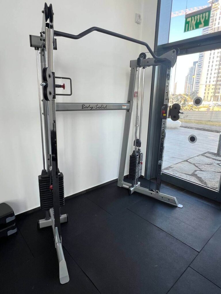 ✔ אזור כוח משולב: כלובי משקולות, קרוס־אובר ותחנות מולטי־טריינר