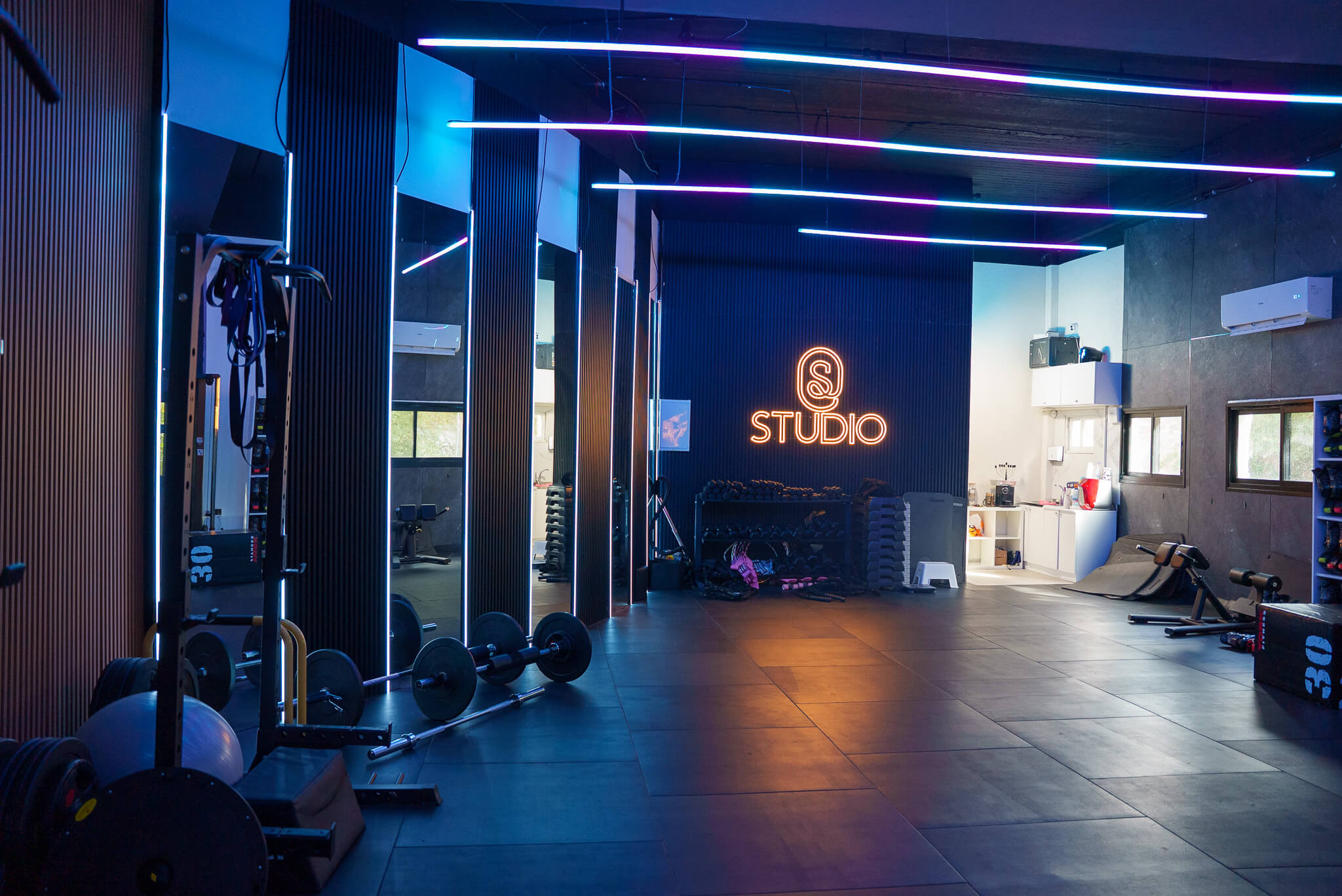 הסטודיו כולל ציוד כושר מקצועי, תחנות אימון מודולריות, אזור אימונים אישיים וחדר חוגים המאובזר בטרמפולינות קנגו לאימונים קבוצתיים.