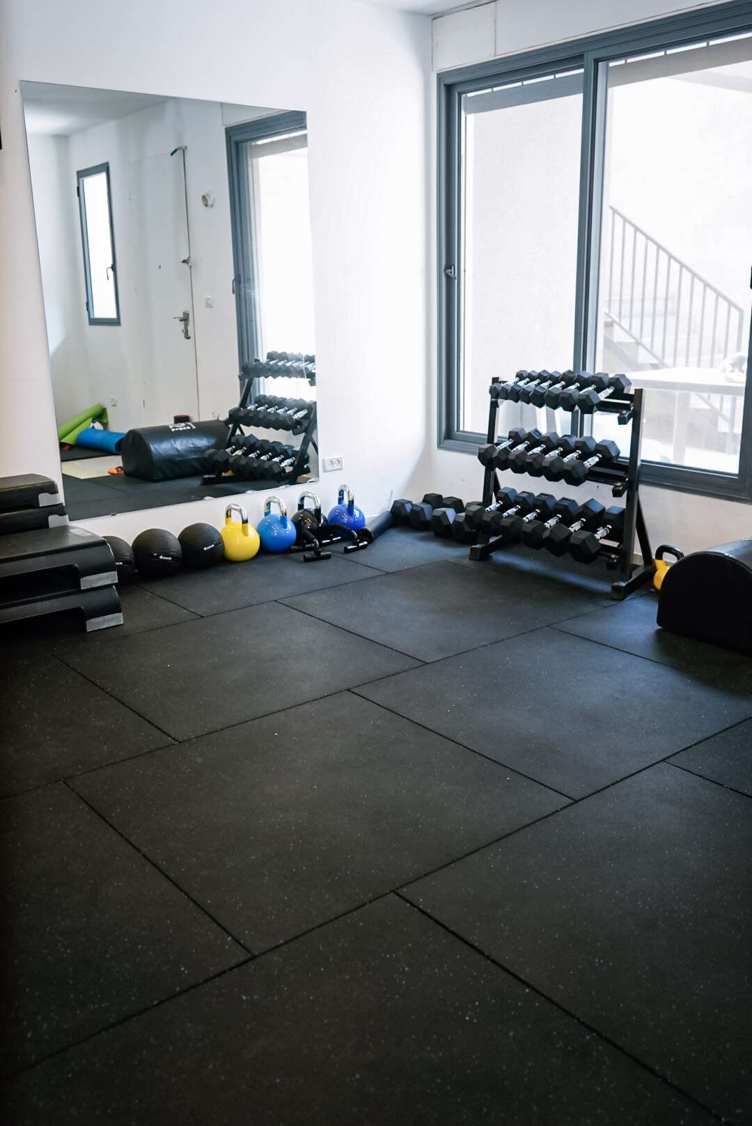 ✔ ציוד ליוגה ופילאטיס, כולל מזרנים, משקולות יד וסטנדים לאחסון