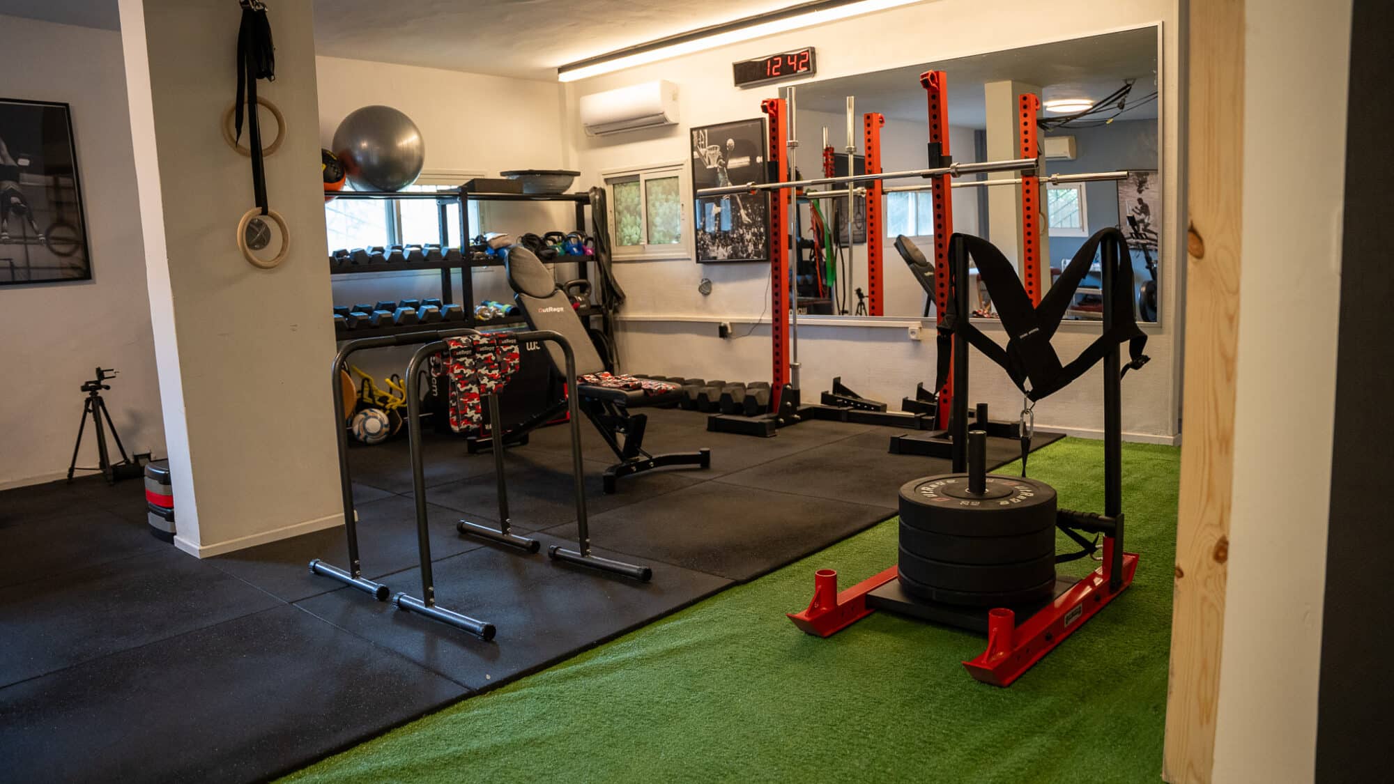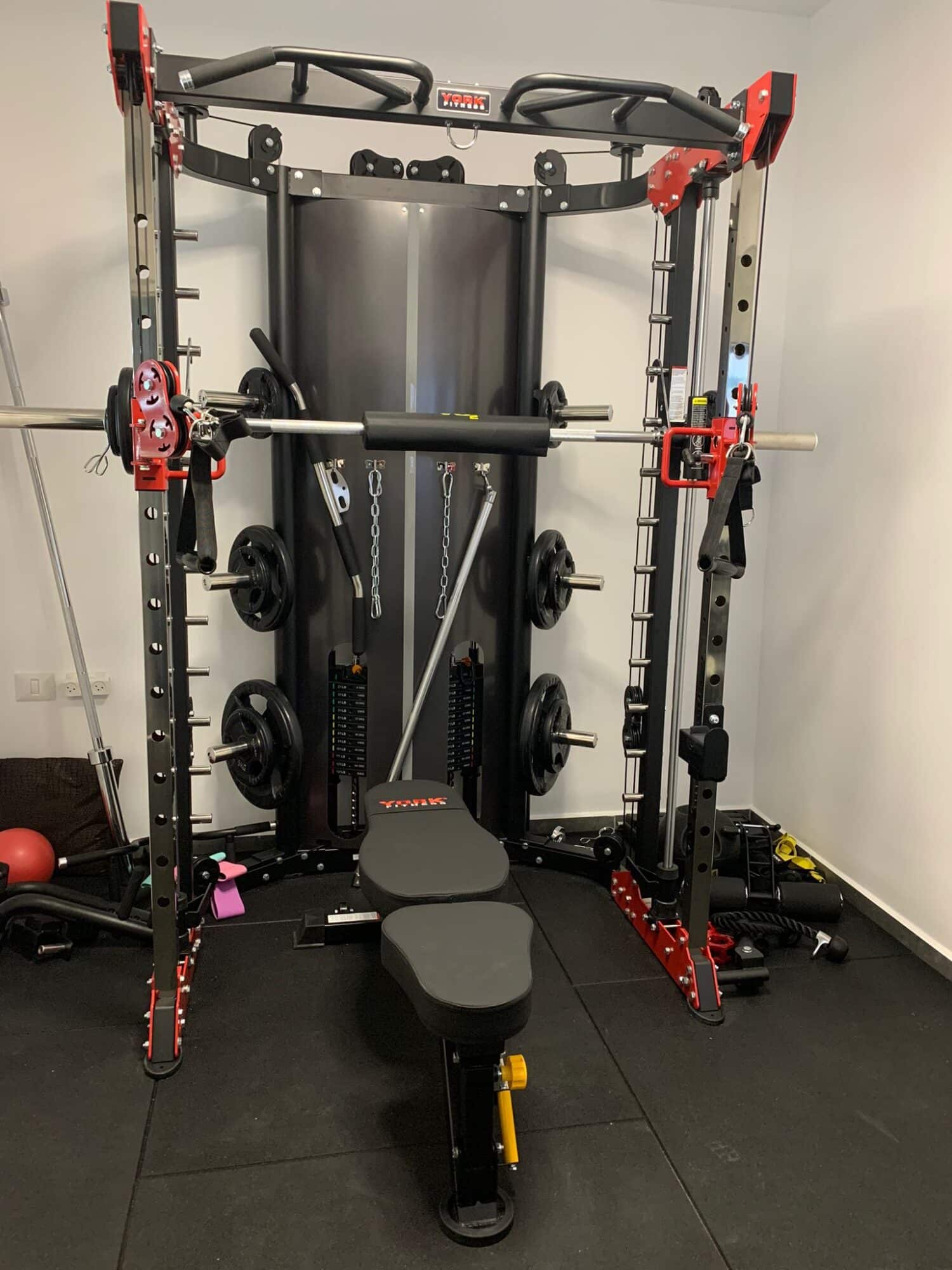 בחלל ניתן למצוא ספת לחיצת חזה של Hoist היוקרתית, כלוב משולב סמית צבעוני, מבחר רב של צלחות באמפר צבעוניות וכו’