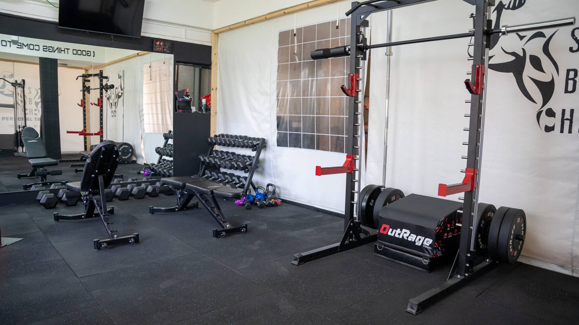 סטודיו אימונים WE TRAIN להשכרה למאמני כושר- כלוב משקולות, ספת היפ טרסט, משקולות וכו’ OutRage Fitness – מתמחים בעיצוב חדרי כושר ופנאי מתקדמים ומודולריים.