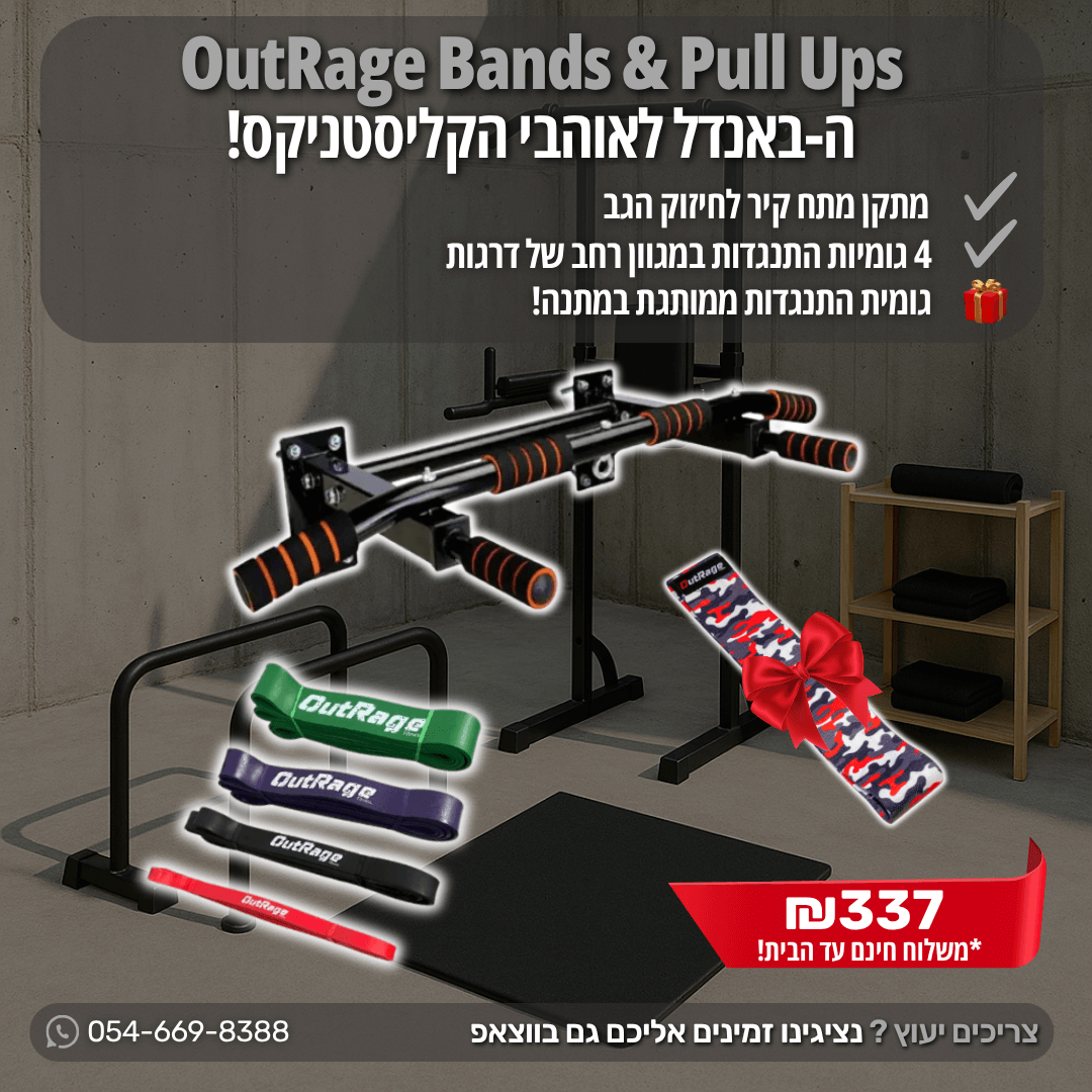 סט Bands & Pull Up מבית OutRage Fitness– מתקן מתח קיר חגורת מתח, סט גומיות התנגדות למתח 4 דרגות וגומיית התנגדות מבד מבית OutRage Fitness מ ת נ ה על כל רכישה של הסט!
