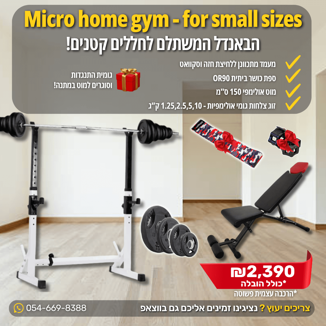 סט Micro home gym מבית OutRage Fitness– סטנד סקוואט ביתי נייד, ספת כושר OR90, מוט אולימפי 150 ס״מ, זוג צלחות גומי 1.25,2.5,5,10 ק”ג , זוג סוגרים למוט אולימפי, וגומיית התנגדות מבד מבית OutRage Fitness מ ת נ ה על כל רכישה של הסט!