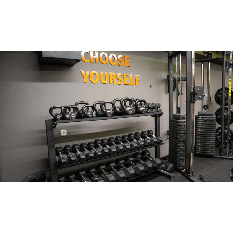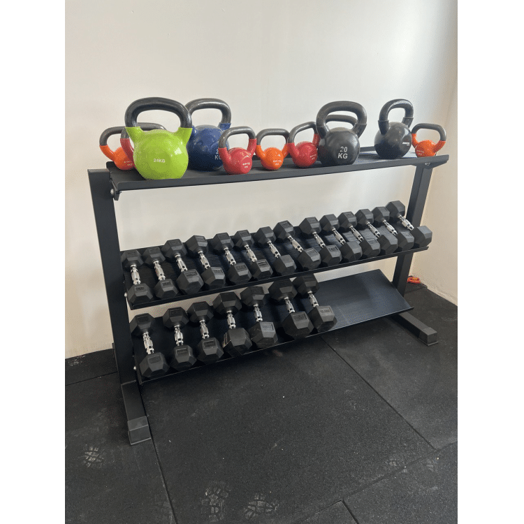שתי הקומות התחתונות מעוצבות בזווית אלכסונית – נוחות במיוחד לאחסון ושליפת משקולות יד.