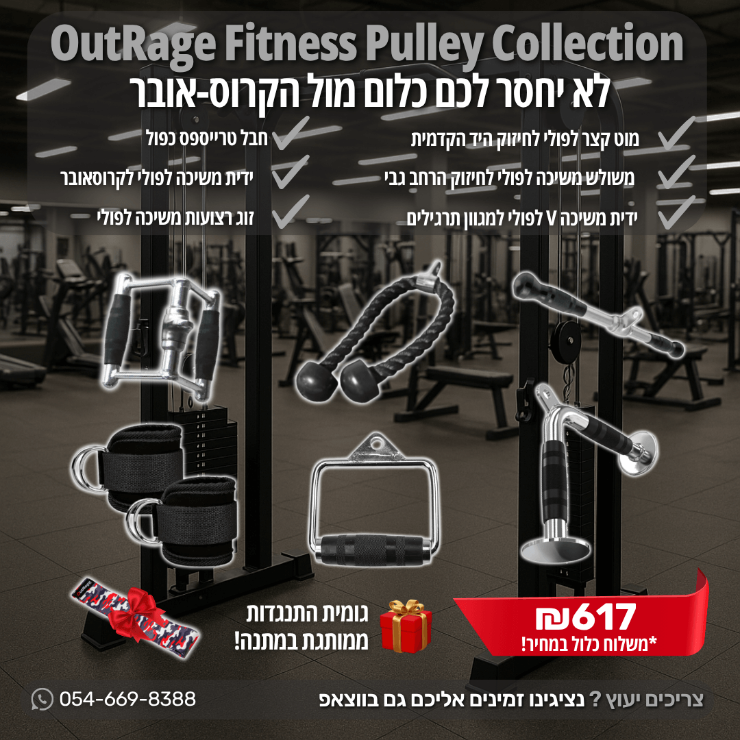 סט Pulley Collection- מוט קצר לפולי , חבל טרייספס כפול ,משולש משיכה לפולי לחיזוק הרחב גבי, ידיות משיכה לפולי לקרוסאובר, ידית משיכה V לפולי, זוג רצועות משיכה לפולי וגומיית התנגדות מבד מבית OutRage Fitness מ ת נ ה על כל רכישה של הסט!